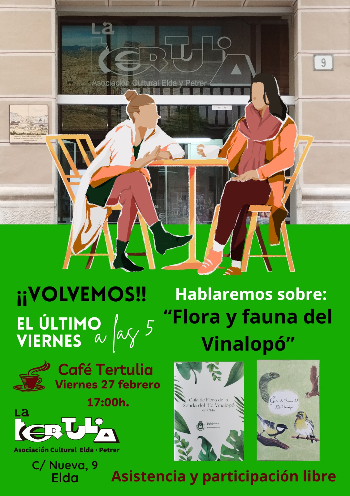 Café Tertulia: «Flora y fauna del Vinalopó 17:00 – 18:0027 de febrero de 2026 Café Tertulia: «Flora y fauna del Vinalopó La Tertulia (C/Nueva,9 Elda)View Location Google Ver calendario completo